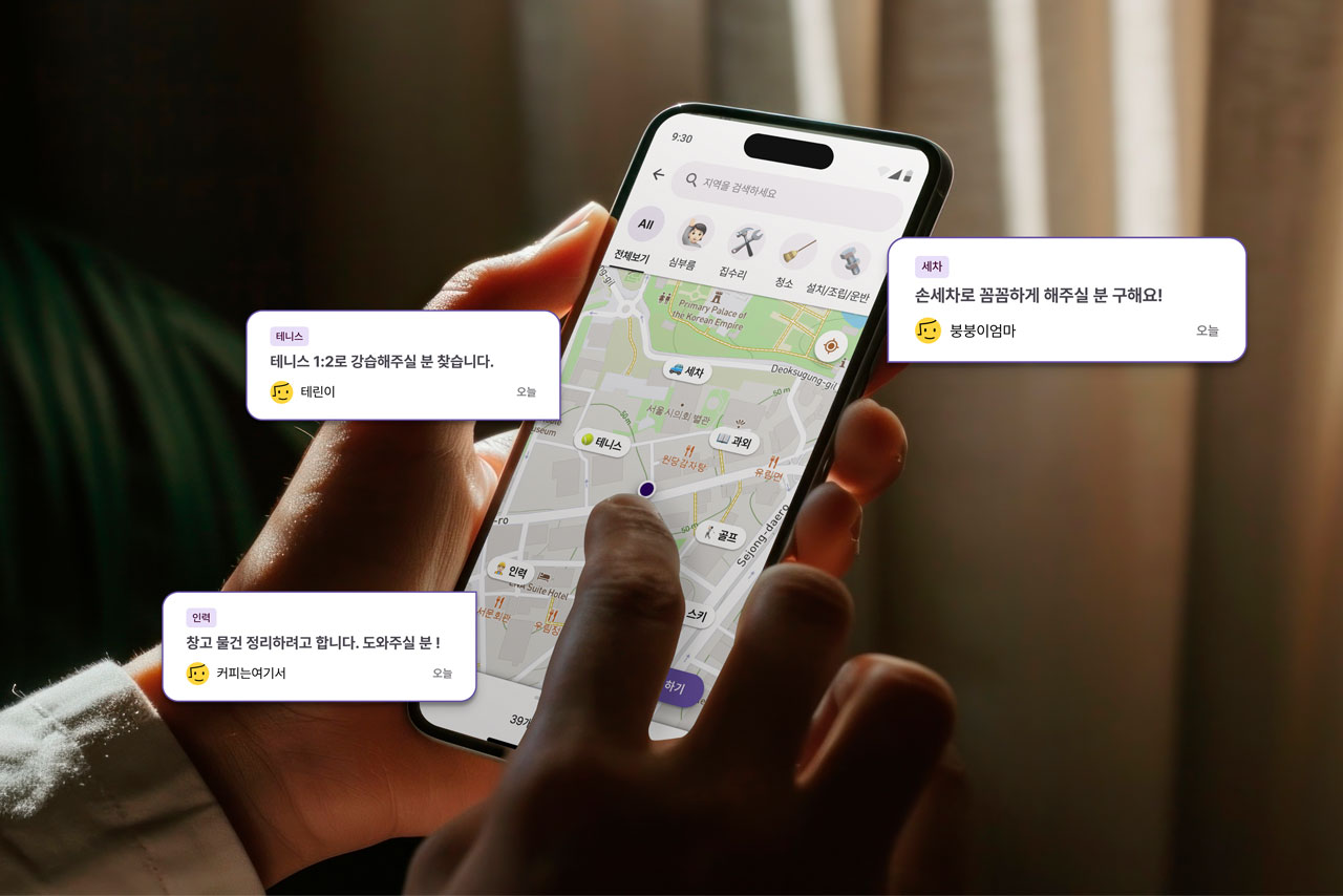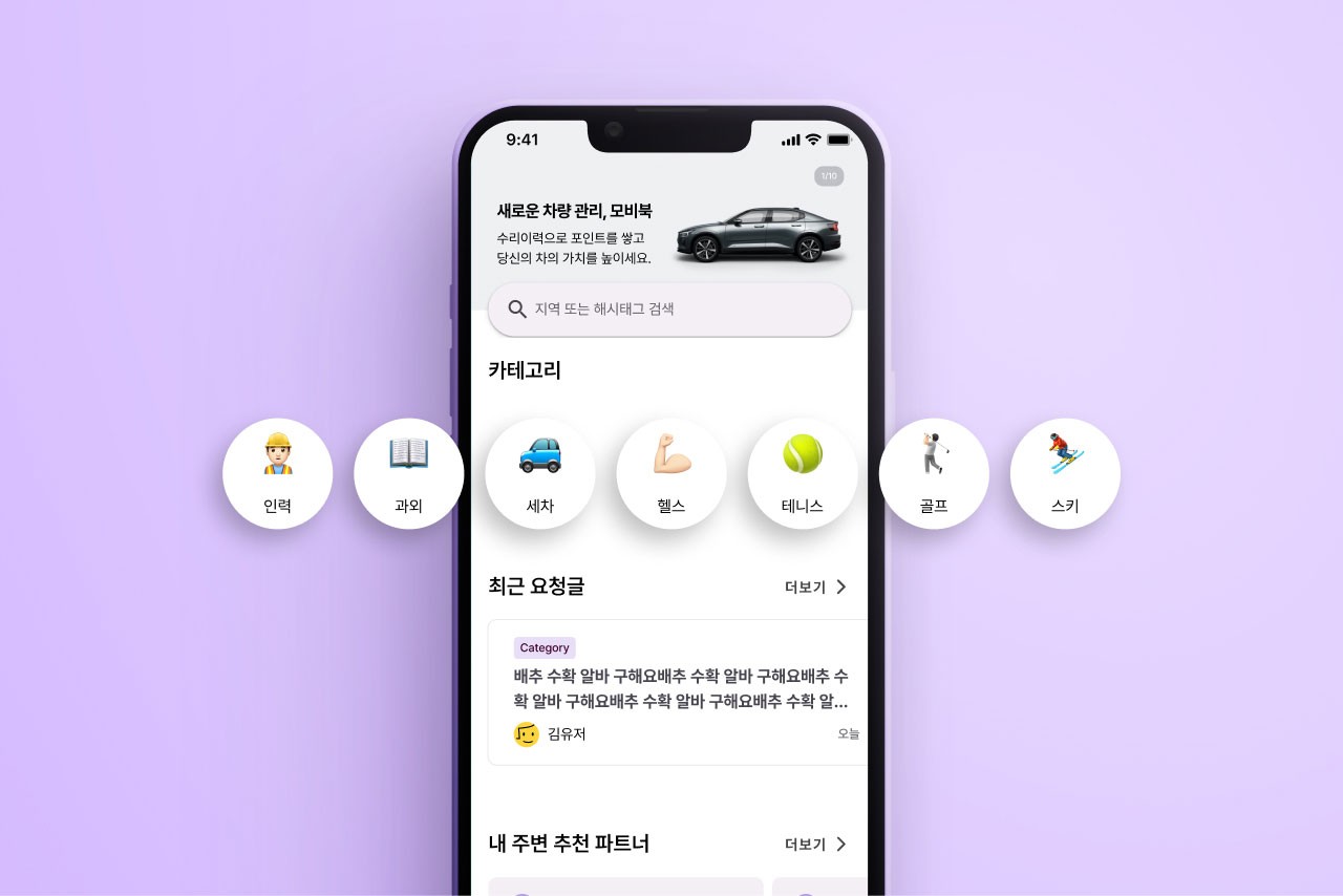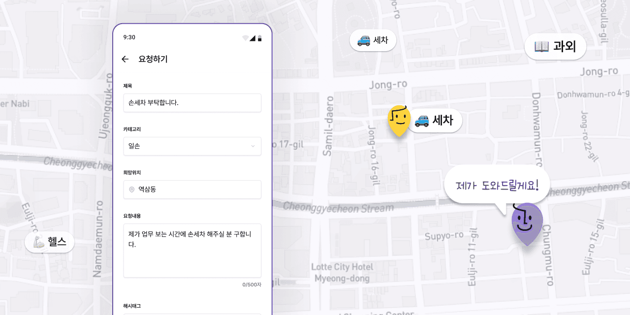 원하는 장소에서 서비스를 요청할 수 있습니다. 시간과 장소 등 필요한 정보를 입력하고 요청을 생성합니다. 요청된 장소 주변 파트너는 이를 수락하고 현장으로 이동할 수 있습니다.